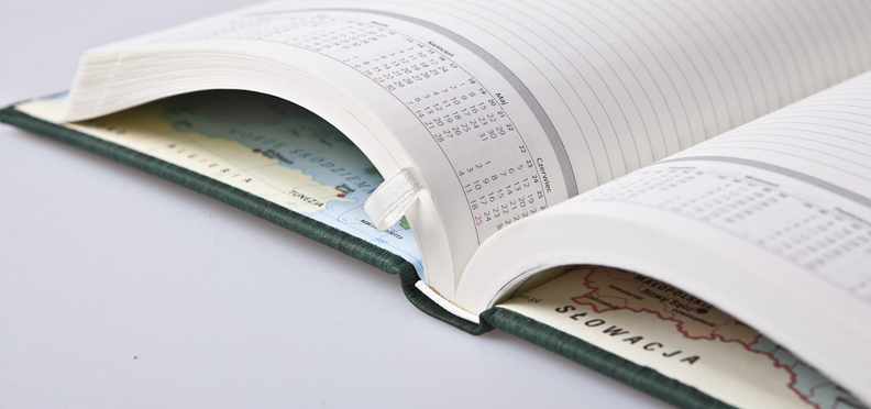 318/820mm podkład karton 300g , główka-kreda błysk 250g , kalendarium 90g,4+0, 12+1, okładka 300, środek 170g, lakierowany