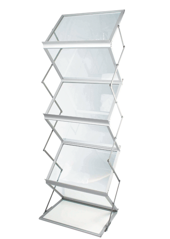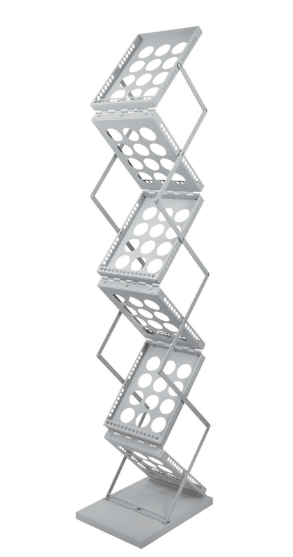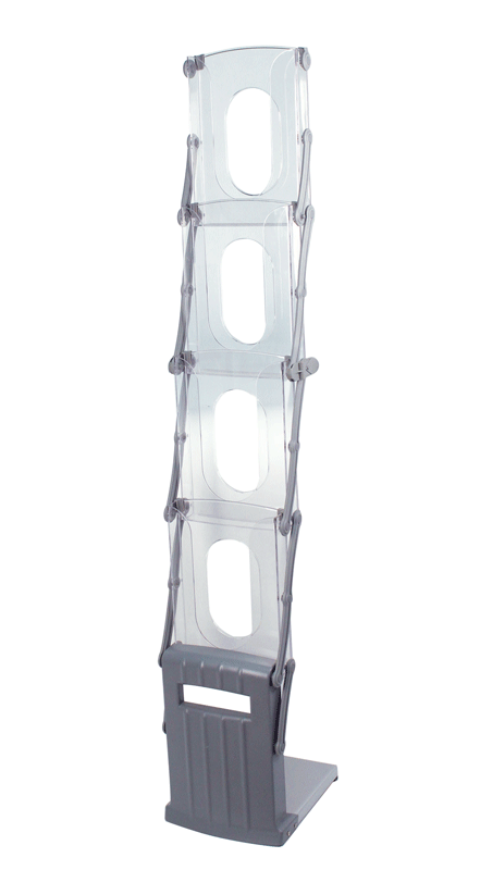 - Lekki, polimerowy stojak na ulotki z 4 kieszonkami o wymiarze A4.