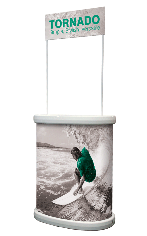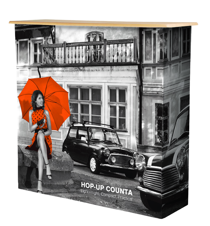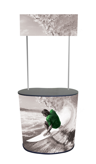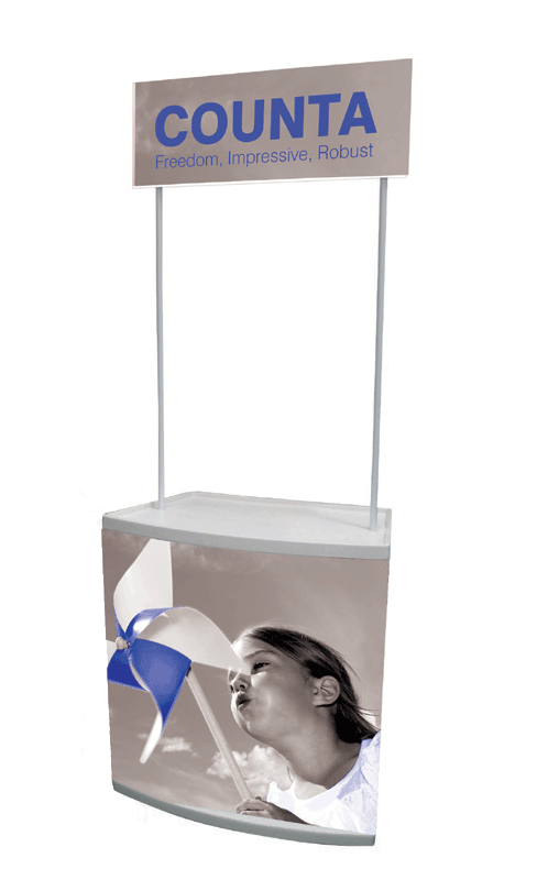 Trybunka Składana - Zestaw rozkładany analogicznie do ścianek POP-UP. Błyskawicznie rozstawiany aluminiowy system, na który nakłada się grafikę w jednym brycie oraz składany blat. Całość bardzo wygodna w transporcie.