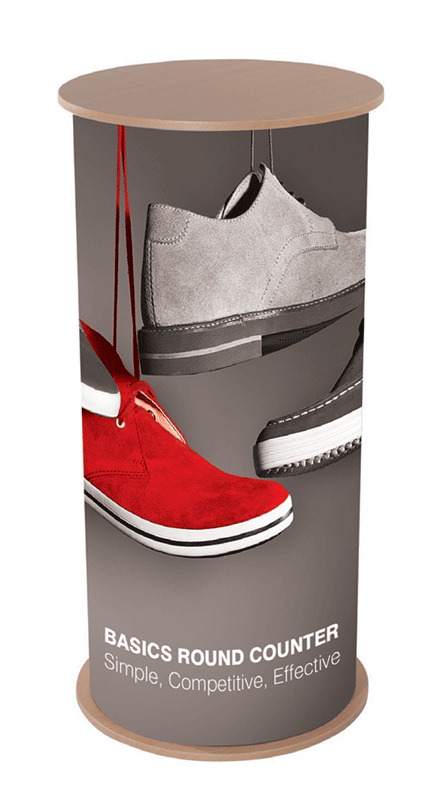 - Okrągła trybunka z oferty Basic, posiada blat i podstawę w okleinie bukowej.